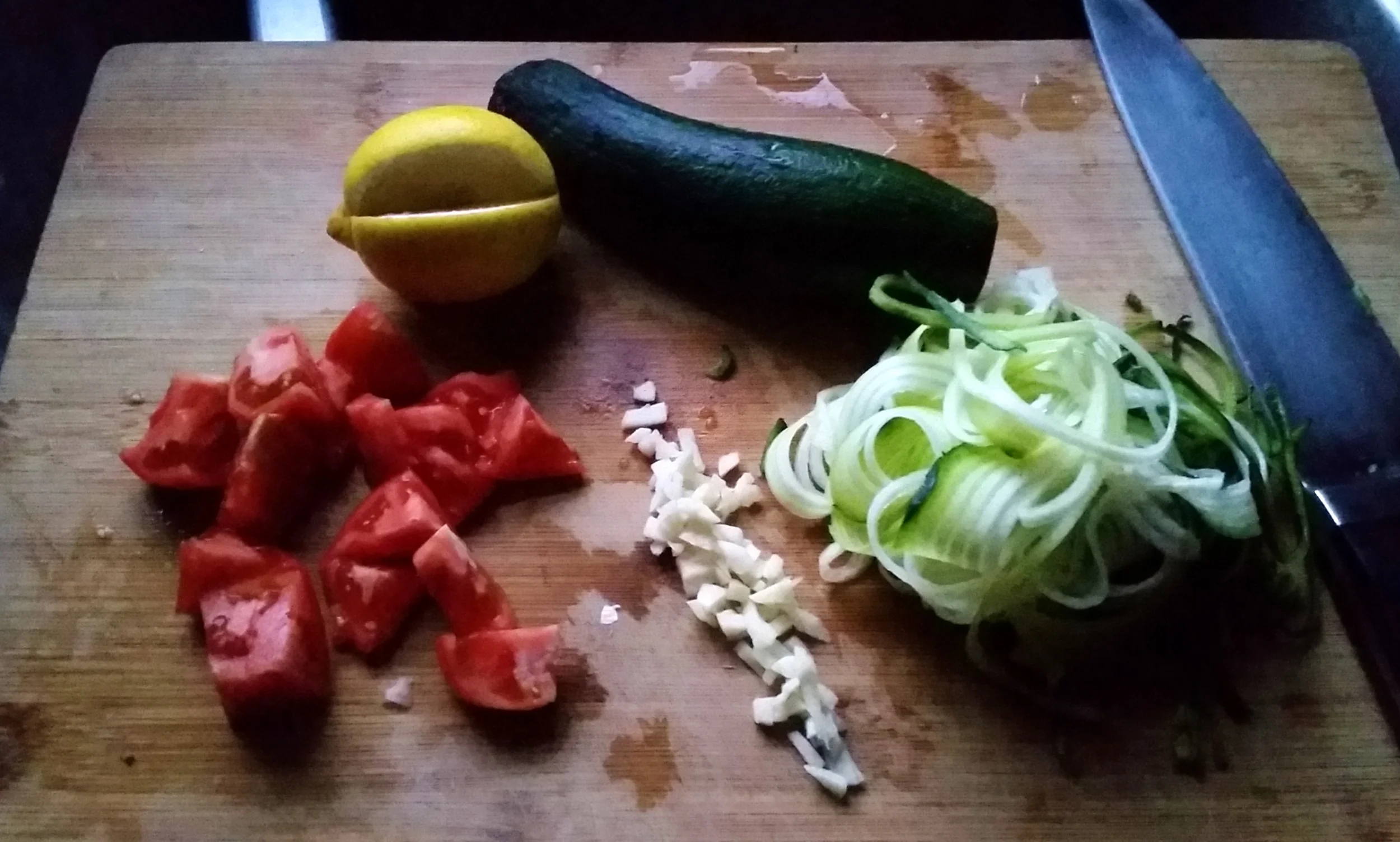 I am going to start off with a simple recipe that takes no more than 15 minutes and uses simple, delicious ingredients. Zucchini, tomato, onion, garlic, olive oil, and a lemon!