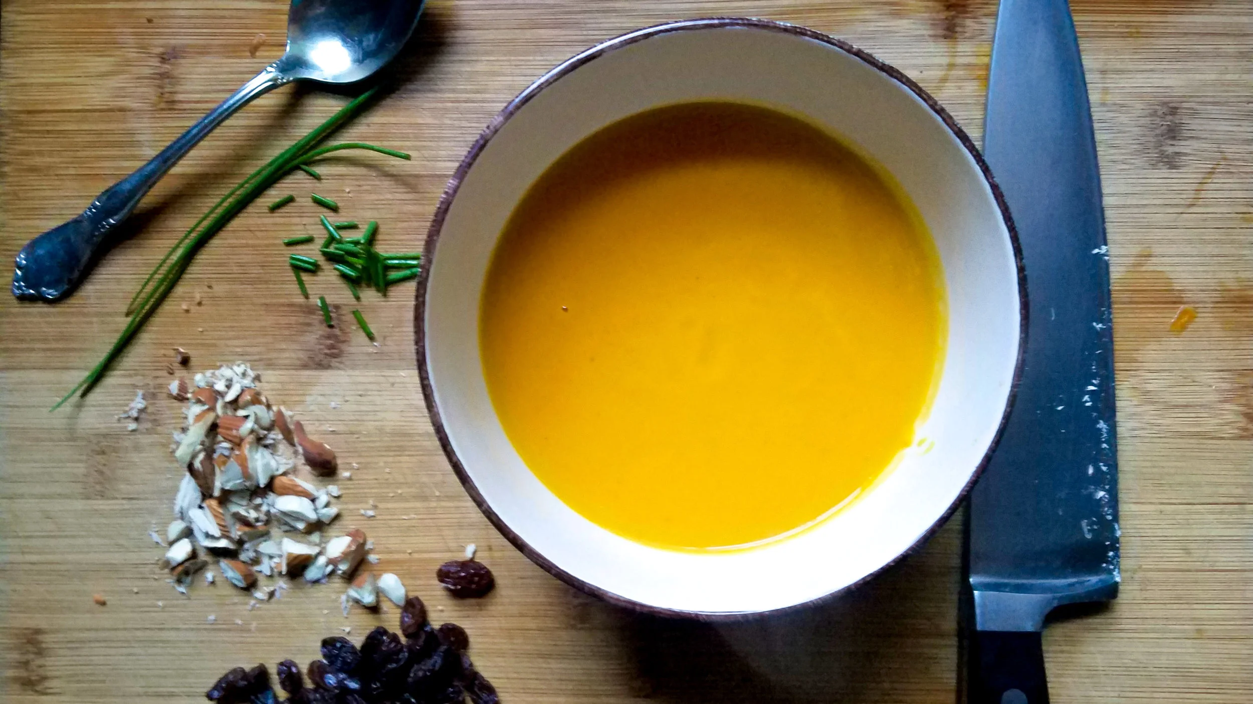 Rainy Day Curried Sweet Potato Soup with Almonds, Raisins, and Kefir